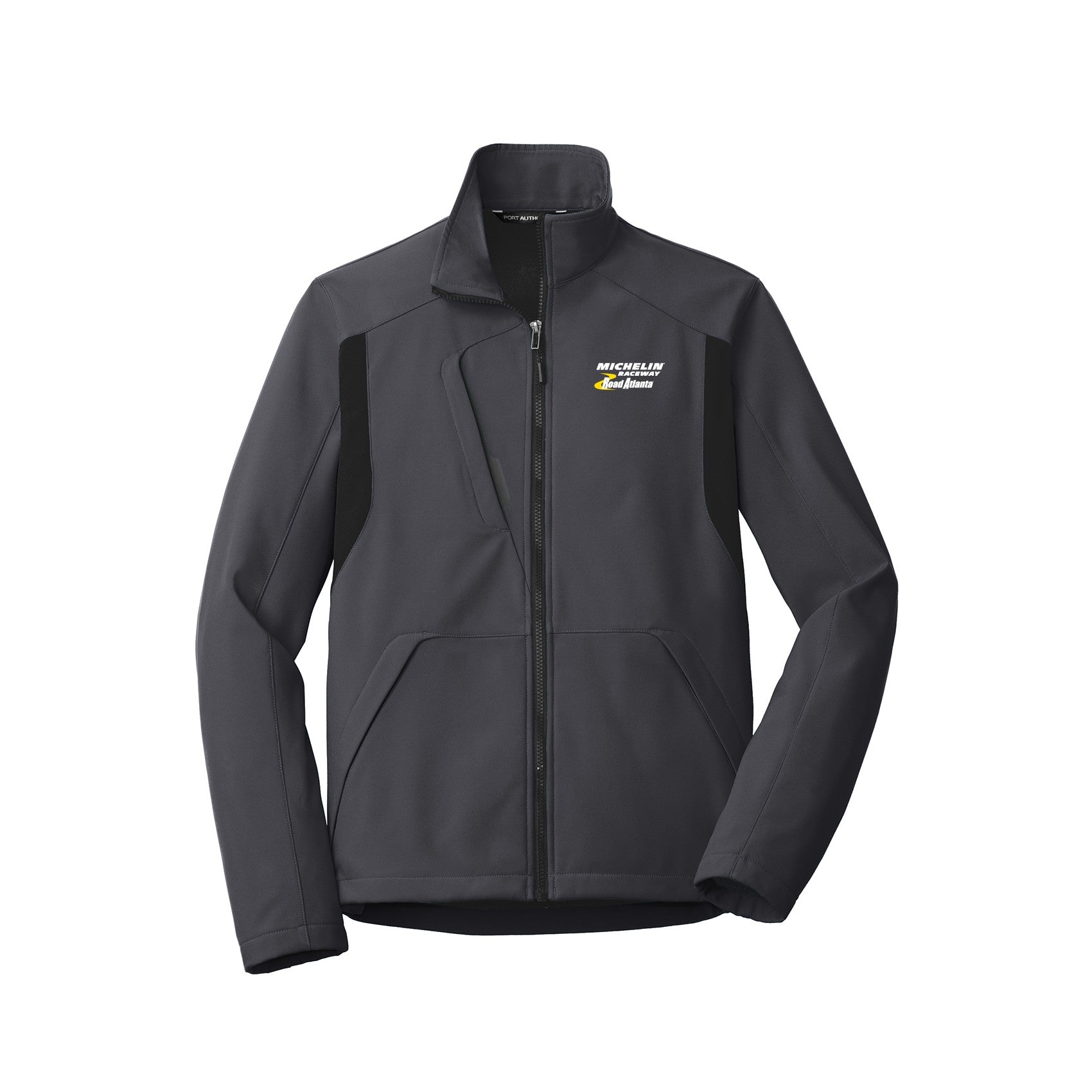 Stay comfortable and showcase your passion with the MRRA Back-Block Soft Shell Jacket in grey and black. Featuring the Michelin Raceway Road Atlanta logo embroidered on the left chest, this jacket's color block design adds a modern touch. Made from middle-weight fabric, it offers balanced warmth and durability, making it ideal for unpredictable weather or race day events.